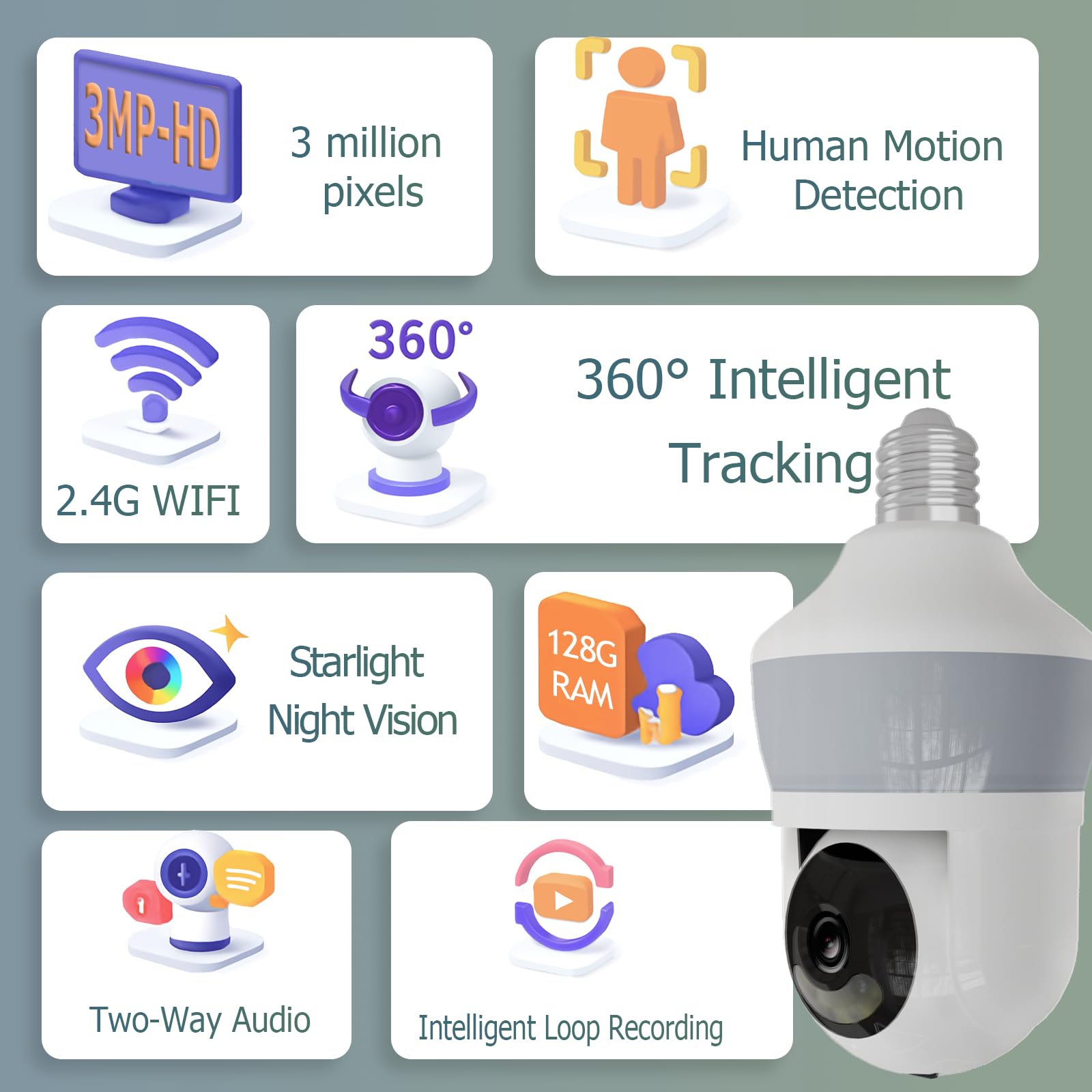 - 5-Minute Setup & Flexible Storage: Screw into any E26/E27 socket (110-240V), connect via Bluetooth + 2.4GHz WiFi. Supports 128GB SD card or cloud storage. Share access with family for 24/7 monitoring.