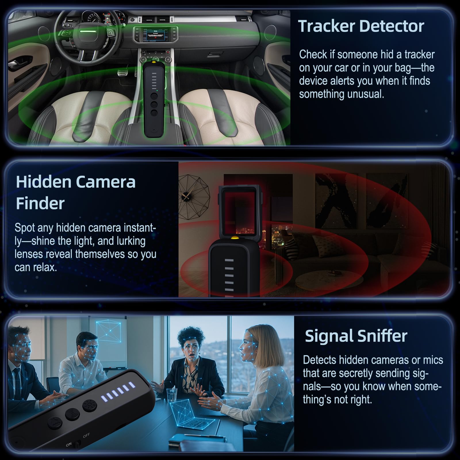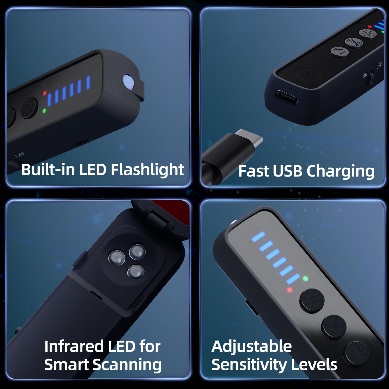 - 【2025 Upgraded Multi-Threat Detection】Find hidden cameras, GPS trackers, and listening devices with RF signal scanning (100MHz-8GHz) + infrared lens detection – perfect for hotels, Airbnb, offices, and cars. No spy gadgets can hide!
